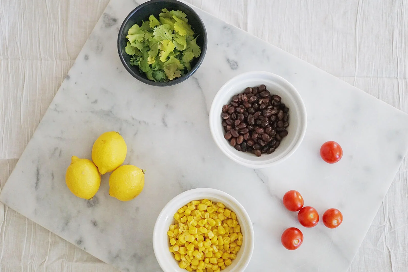Once the sweet potatoes and chicken are done cooking, add them to a large bowl with the black beans, bell pepper, onion, and cilantro.